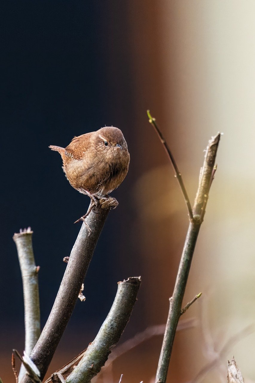 이 사진에는 얇은 가지 끝에 앉아 있는 작은 갈색 새 한 마리가 보입니다. 새의 털은 부드러워 보이며, 머리는 약간 앞으로 기울어져 있습니다. 배경은 모호하게 처리되어 새와 가지가 뚜렷하게 돋보입니다. 가지는 오른쪽으로 약간 기울어져 있으며, 새는 카메라를 향해 정면을 바라보고 있습니다.