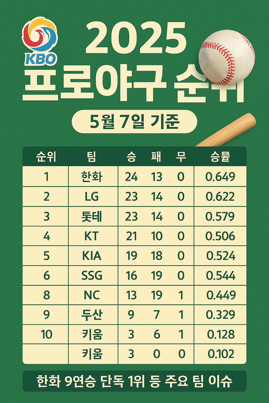 2025년 KBO 리그는 시즌 초반부터 치열한 순위 경쟁이 펼쳐지고 있습니다. 특히 한화 이글스가 9연승을 기록하며 단독 1위에 올라섰습니다.